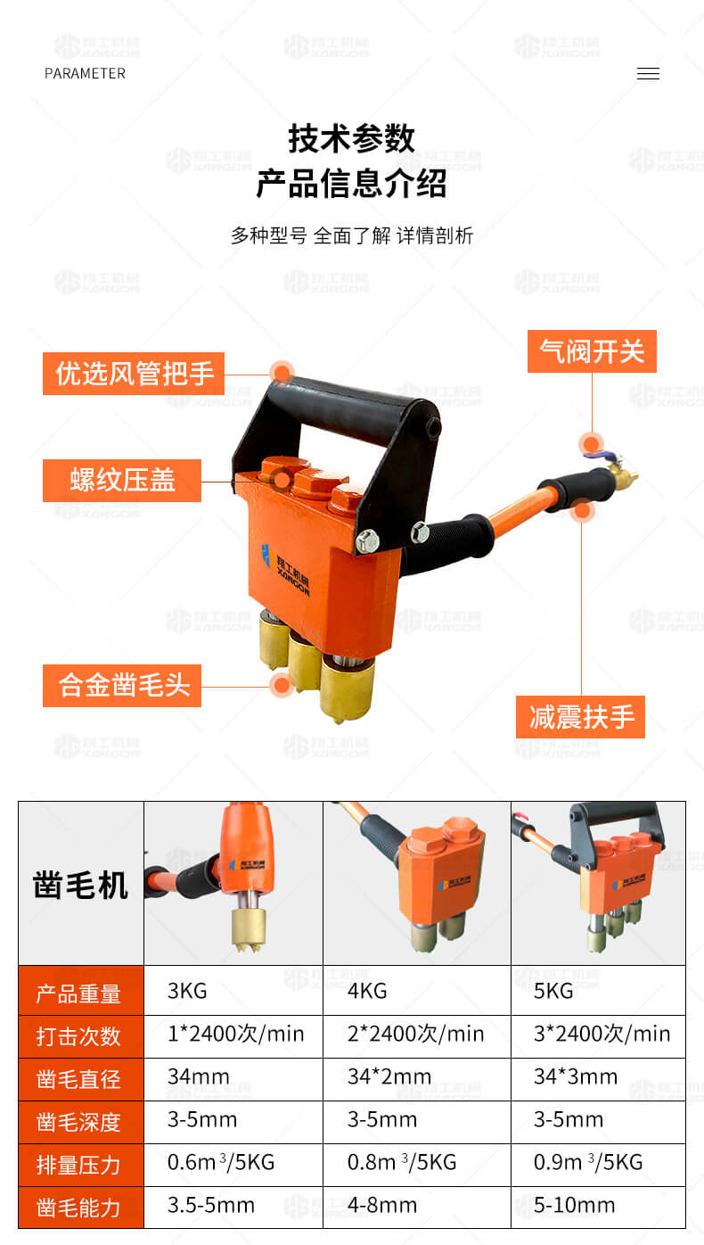 手持式鑿毛機主要用于混凝土剔鑿,水泥表面的打點、粗糙、清理浮漿;兩次鋪裝前清理舊的混凝土。 手持式鑿毛機是利用活塞打擊的方法在混凝土表面鑿毛,用來使新舊混凝土粘結(jié)