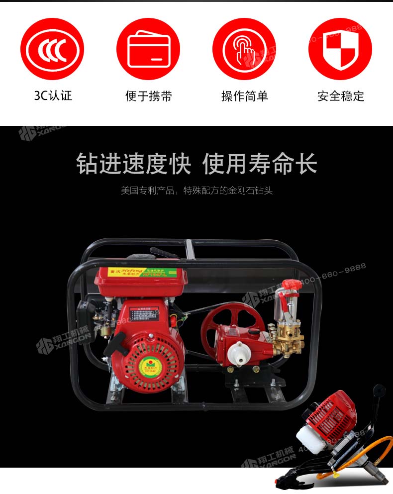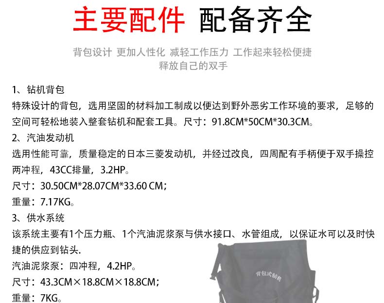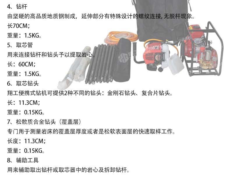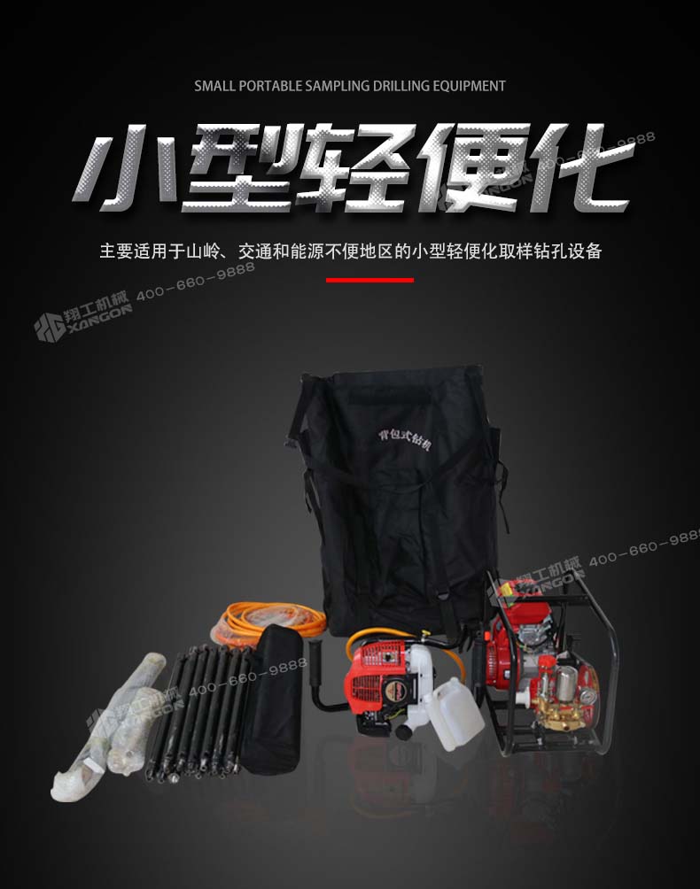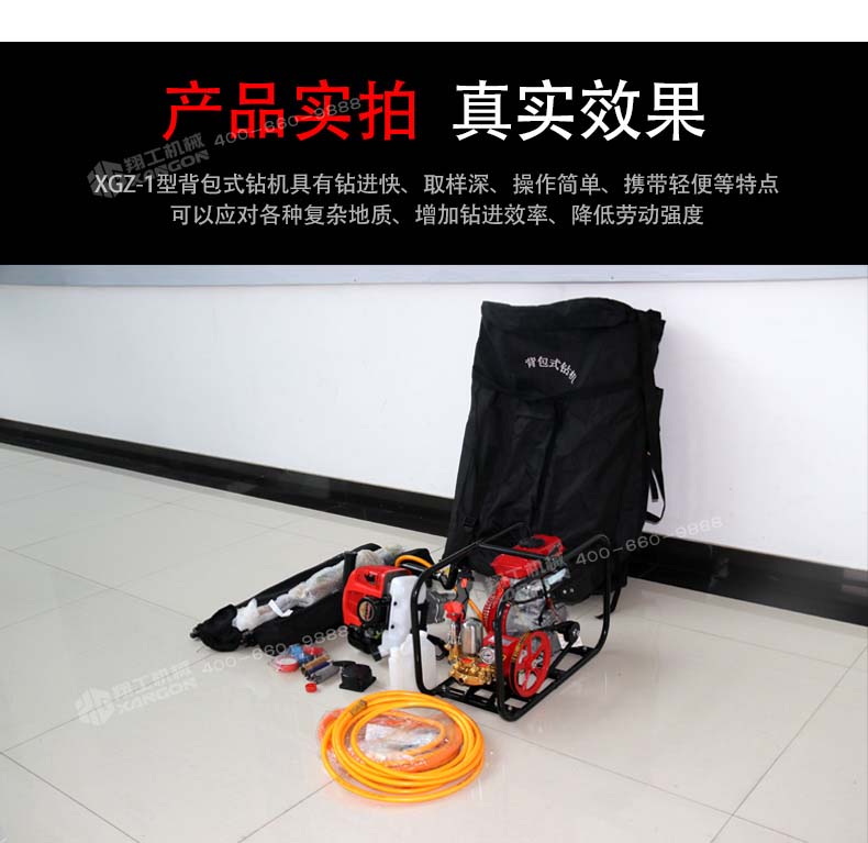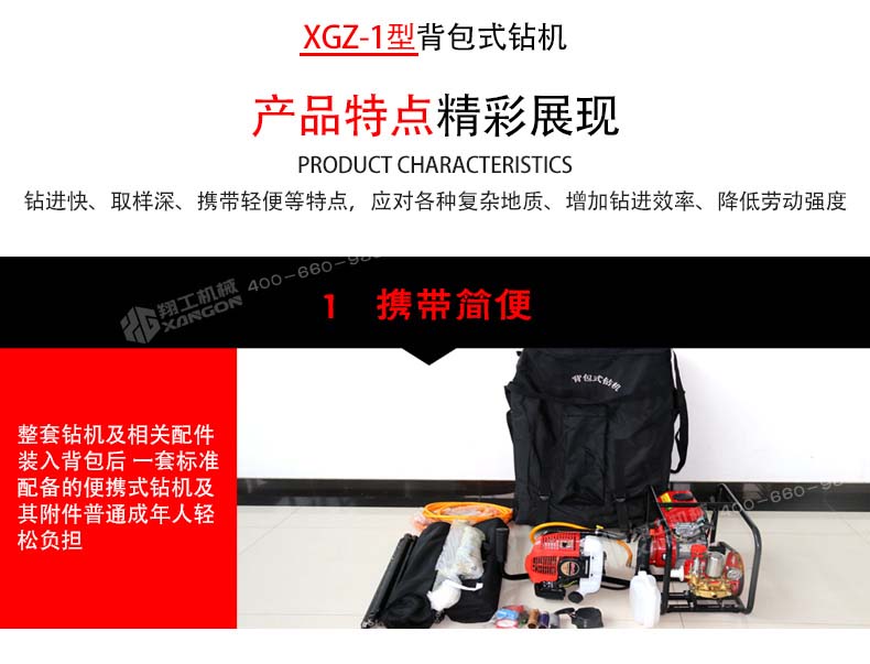 XGZ-1型背包式鉆機(jī)具有鉆進(jìn)快、取樣深、操作簡單、攜帶輕便等特點(diǎn),可以應(yīng)對各種復(fù)雜地質(zhì)、增加鉆進(jìn)效率、降低勞動強(qiáng)度,適用于高山、野外等交通不便的地形、勘探、石油勘測、礦物考察、建筑取樣、爆裂鉆孔等工作,可以卓效的替代中型巖芯鉆機(jī)的淺層巖芯取樣勘探工作。