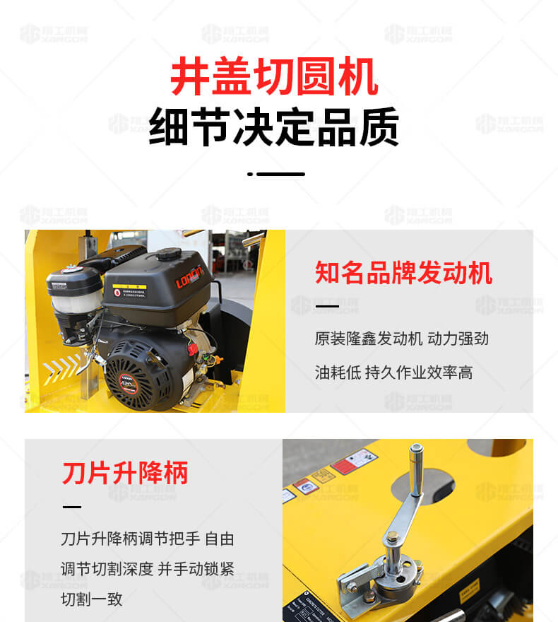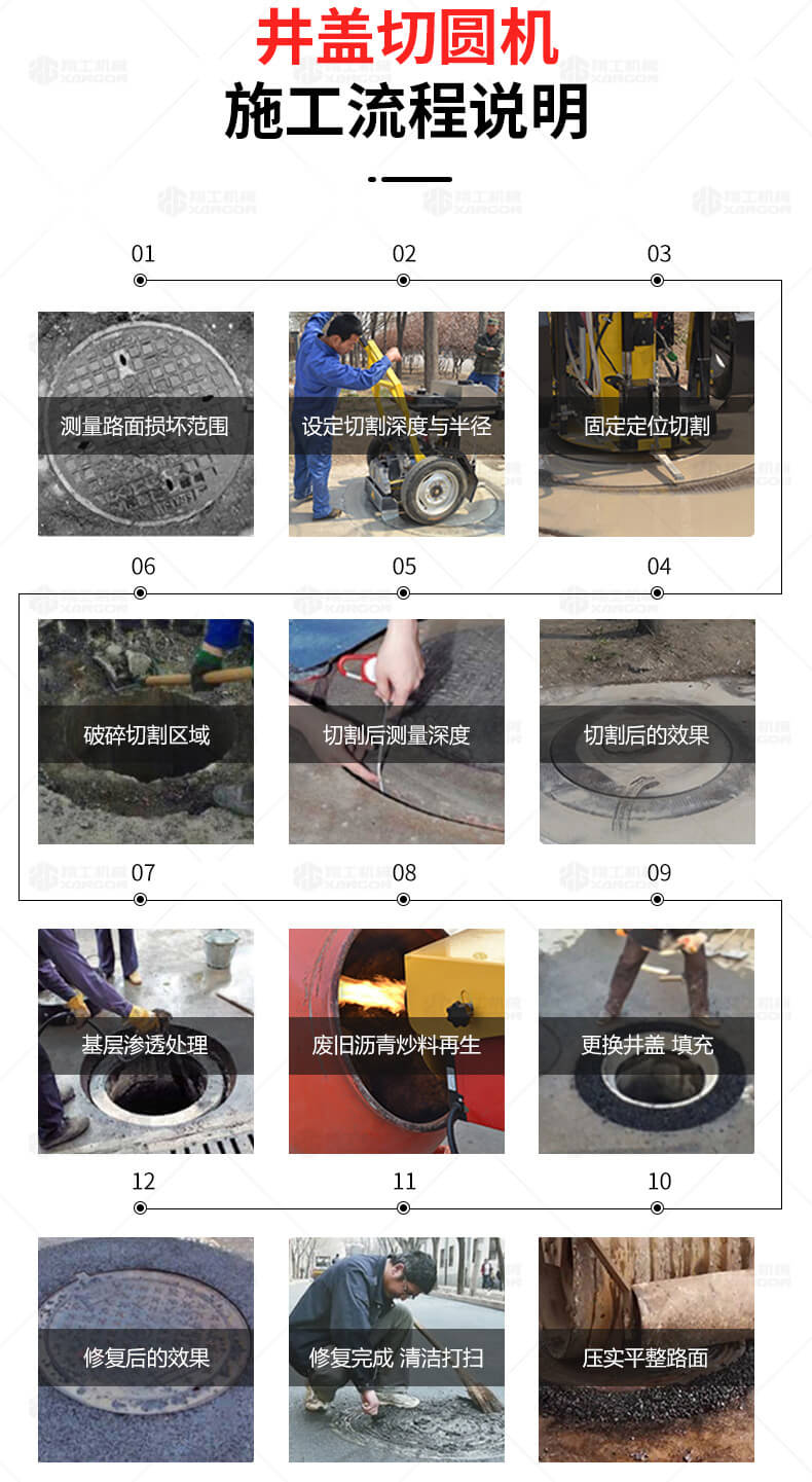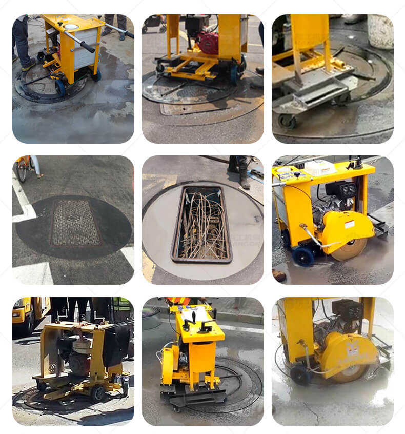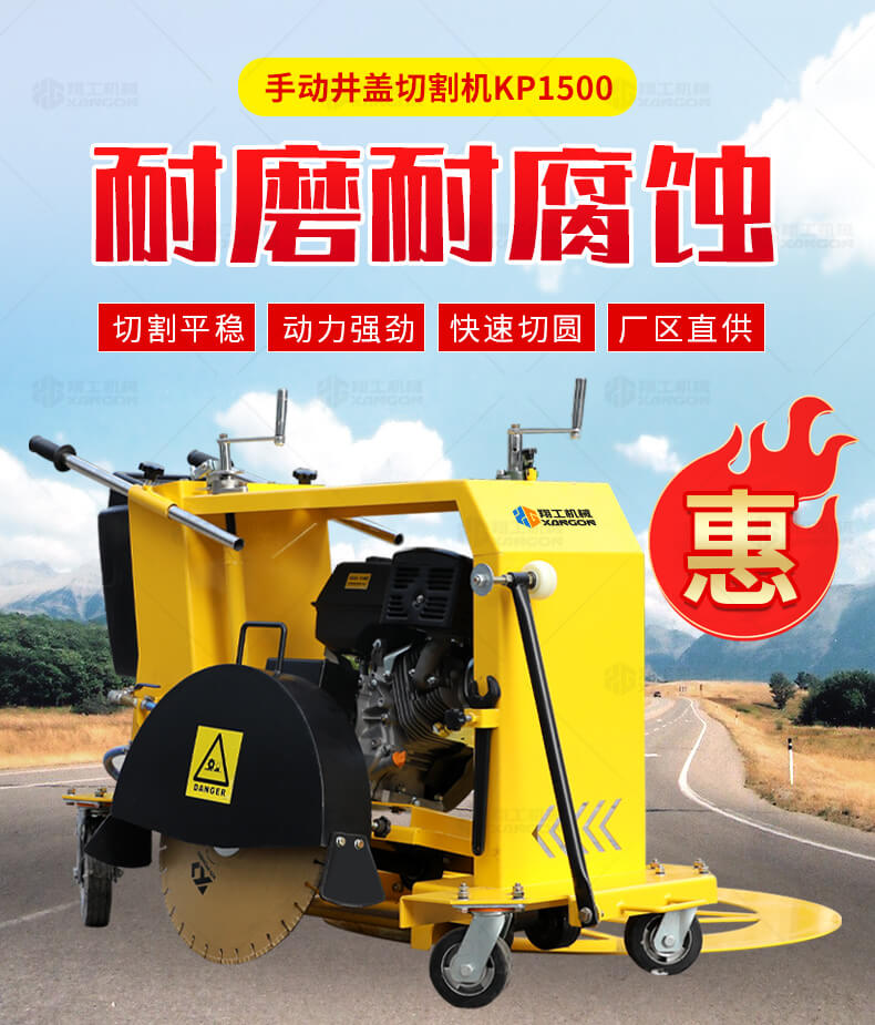 XG-1500型井蓋切割機(jī),專門用于對(duì)城市道路中機(jī)動(dòng)車道等井蓋周圍的水泥混凝土或?yàn)r青路面進(jìn)行圓形切割。為清楚井蓋周圍的破損路面提供分割區(qū)域,恢復(fù)后的地面美觀,延長(zhǎng)了路面的使用壽命。