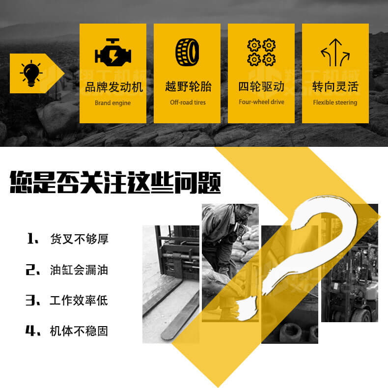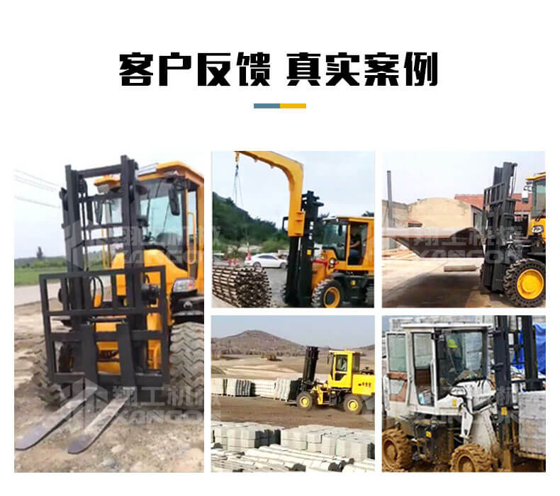 3.普通叉車只能在平整的路面上作業(yè),而越野叉車既可以在普通路面上作業(yè),還可以在山路泥路崎嶇道路作業(yè),輪胎抓地力強,不打滑。