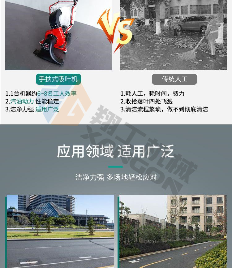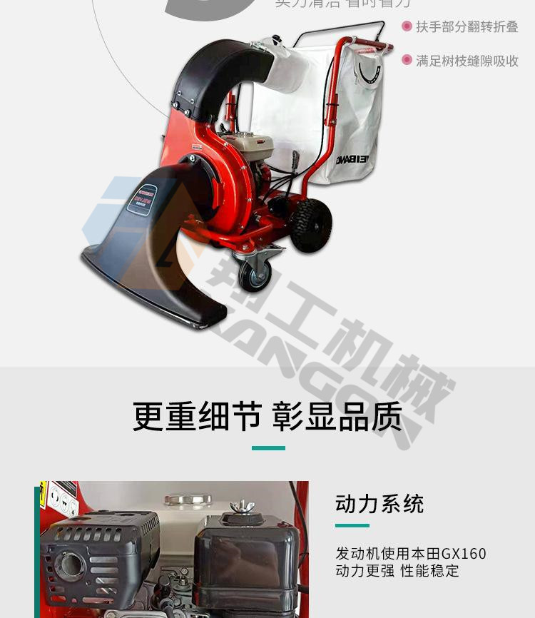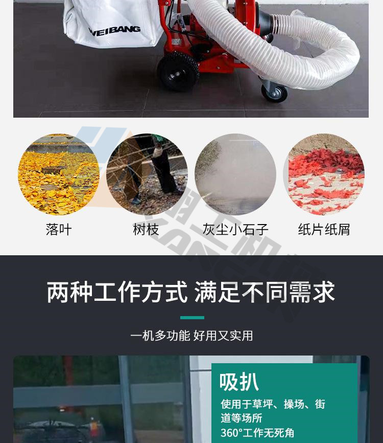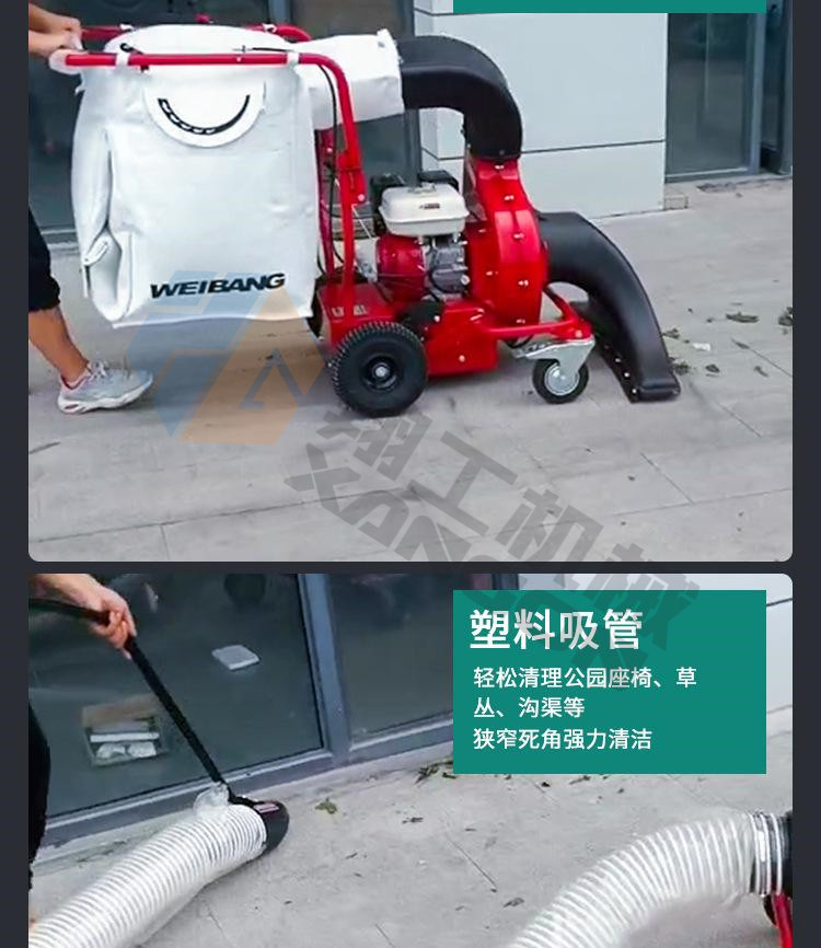 該設(shè)備工作效率高,比人工清掃效率高幾倍,可手推助力行走。垃圾儲(chǔ)存袋采用便捷式方式,便于更換垃圾,且使用成本較低。吸口可配置延長管,用來吸收綠化帶中的落葉和垃圾。吸口高度可調(diào),面對(duì)落葉較厚或大的法桐樹葉較多的區(qū)域,也能輕松收集干凈。目前以用在環(huán)衛(wèi)人行道、園林、物業(yè)小區(qū)、校園、公園、廣場(chǎng)、工廠廠區(qū)和車間等得到廣泛應(yīng)用。