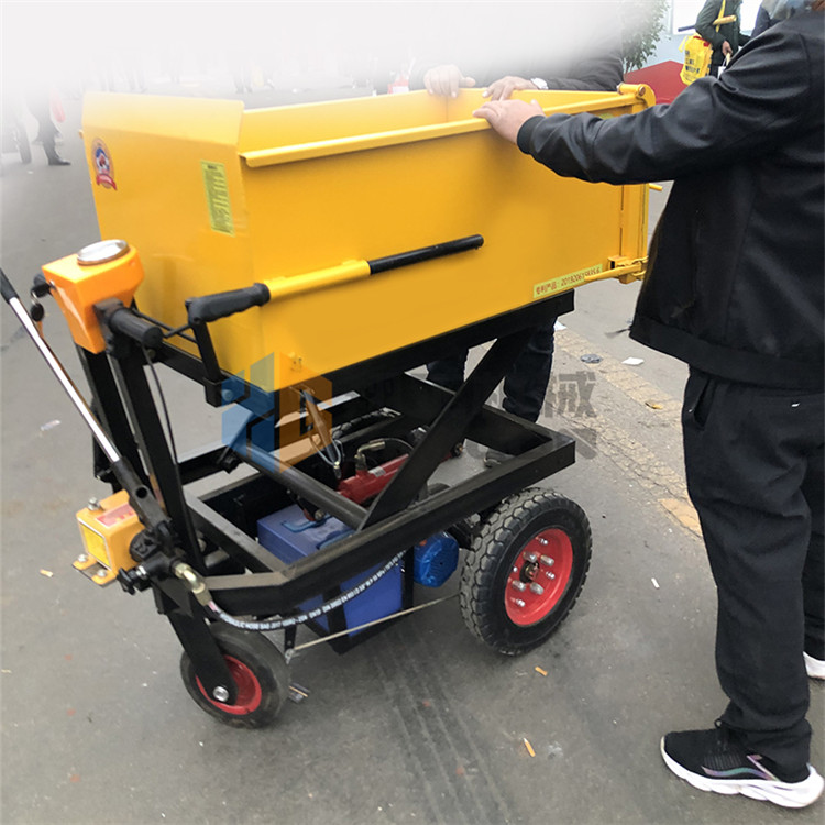 升降式混凝土小推車其主要特點(diǎn)是料斗升降式、尾后出料口和電動(dòng)行走。
