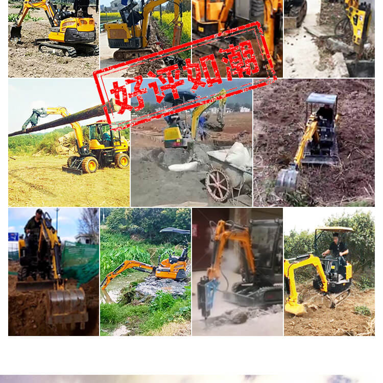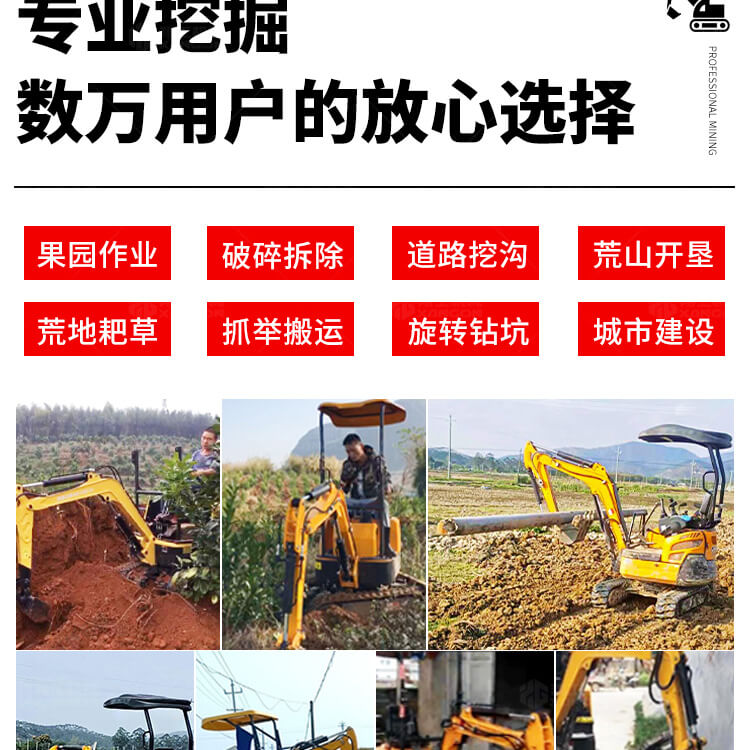 挖掘機(jī)廣泛應(yīng)用于果園苗圃、園林綠化、山地開(kāi)荒、農(nóng)田改造、開(kāi)挖自來(lái)水機(jī)電纜管道、室內(nèi)拆除、地面破碎、蔬菜大棚、養(yǎng)殖場(chǎng)、各種礦井及地道施工等。