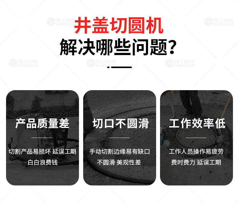 XG-1500型井蓋切割機(jī),專門用于對(duì)城市道路中機(jī)動(dòng)車道等井蓋周圍的水泥混凝土或?yàn)r青路面進(jìn)行圓形切割。為清楚井蓋周圍的破損路面提供分割區(qū)域,恢復(fù)后的地面美觀,延長(zhǎng)了路面的使用壽命。