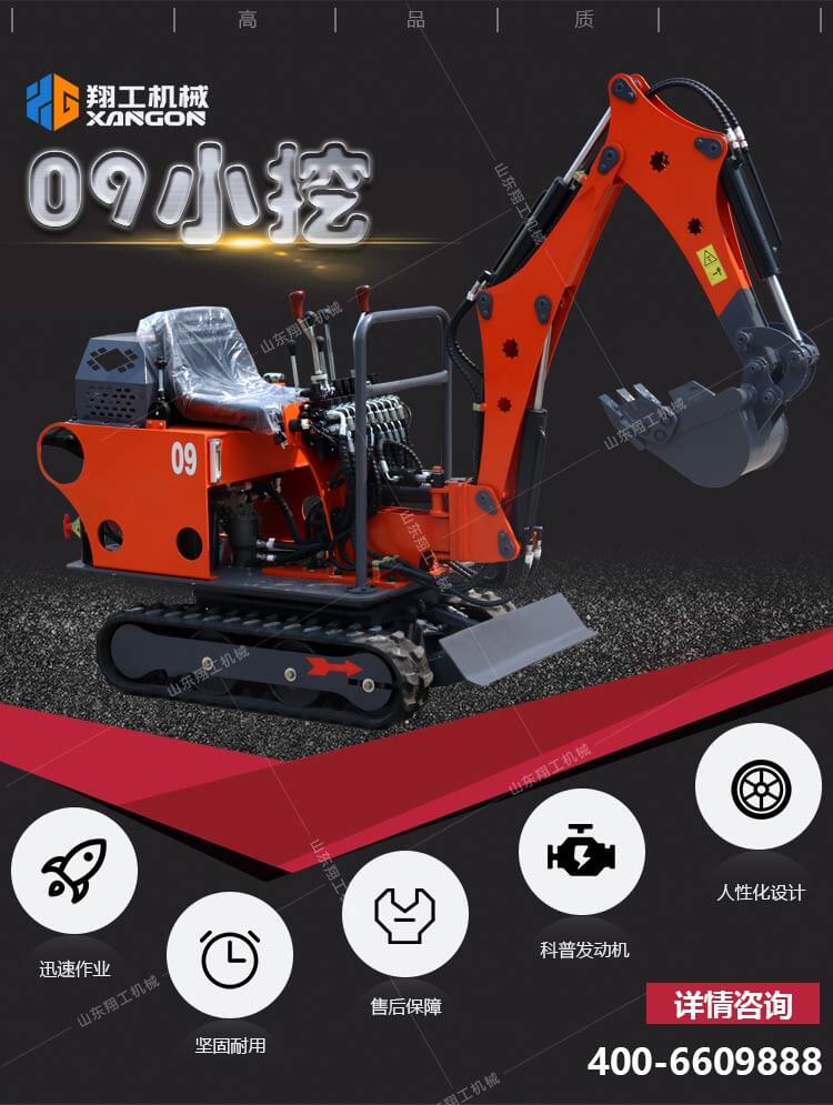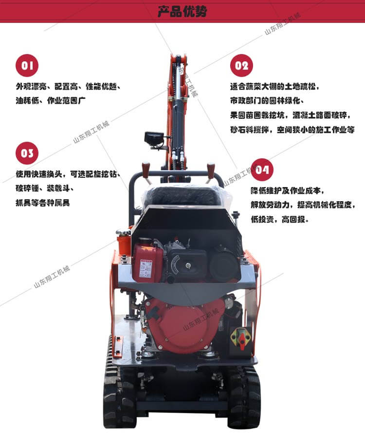 該產(chǎn)品外觀漂亮、配置高、性能優(yōu)越、油耗低、作業(yè)范圍廣,適合蔬菜大棚的土地疏松,市政部門的園林綠化、果園苗圃栽挖坑,混凝土路面破碎,砂石料攪拌,空間狹小的施工作業(yè)等,使用快速換頭,可選配旋挖鉆、破碎錘、裝載斗、抓具等各種屬具,降低維護(hù)及作業(yè)成本,解放勞動(dòng)力,提高機(jī)械化程度,低投資,高回報(bào)。