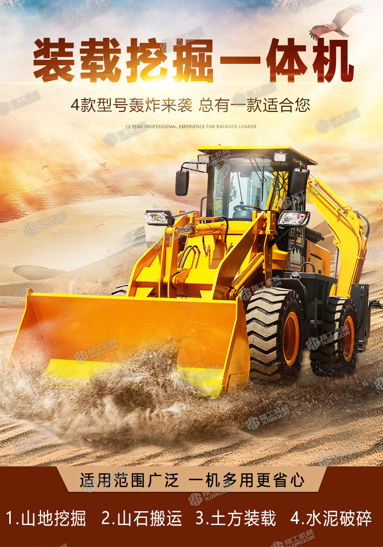 挖掘裝載一體機(jī)俗稱“兩頭忙”。因?yàn)樗哂歇?dú)特的構(gòu)造,前端是裝載裝置,后端為挖掘裝置。在工地內(nèi),您只需要轉(zhuǎn)動(dòng)一下座椅,即可完成從裝載機(jī)到挖掘機(jī)操作手角色的轉(zhuǎn)變?!皟深^忙”屬于小型多功能工程機(jī)械的一種,一般在大工程完成后的小工程中使用。它可配多種工作裝置及輔具,進(jìn)行挖掘、鏟裝、路面破碎、平整場(chǎng)地、開(kāi)挖溝渠、鋪設(shè)管道等多種作業(yè)。
