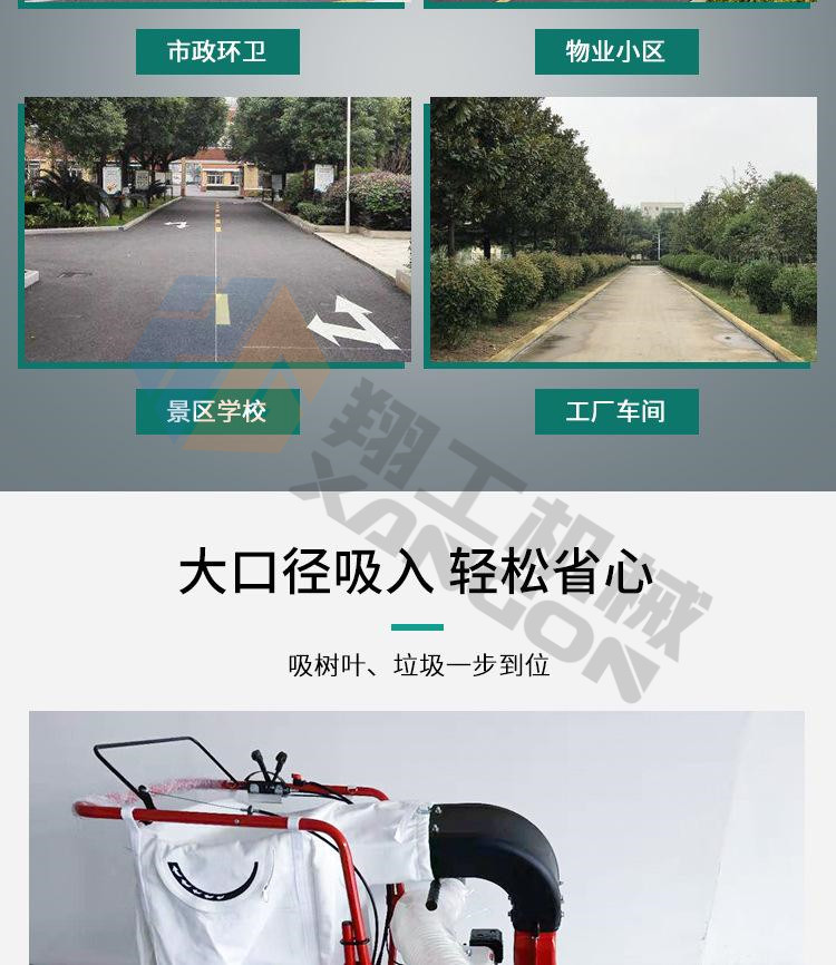 該設(shè)備工作效率高,比人工清掃效率高幾倍,可手推助力行走。垃圾儲(chǔ)存袋采用便捷式方式,便于更換垃圾,且使用成本較低。吸口可配置延長管,用來吸收綠化帶中的落葉和垃圾。吸口高度可調(diào),面對(duì)落葉較厚或大的法桐樹葉較多的區(qū)域,也能輕松收集干凈。目前以用在環(huán)衛(wèi)人行道、園林、物業(yè)小區(qū)、校園、公園、廣場(chǎng)、工廠廠區(qū)和車間等得到廣泛應(yīng)用。