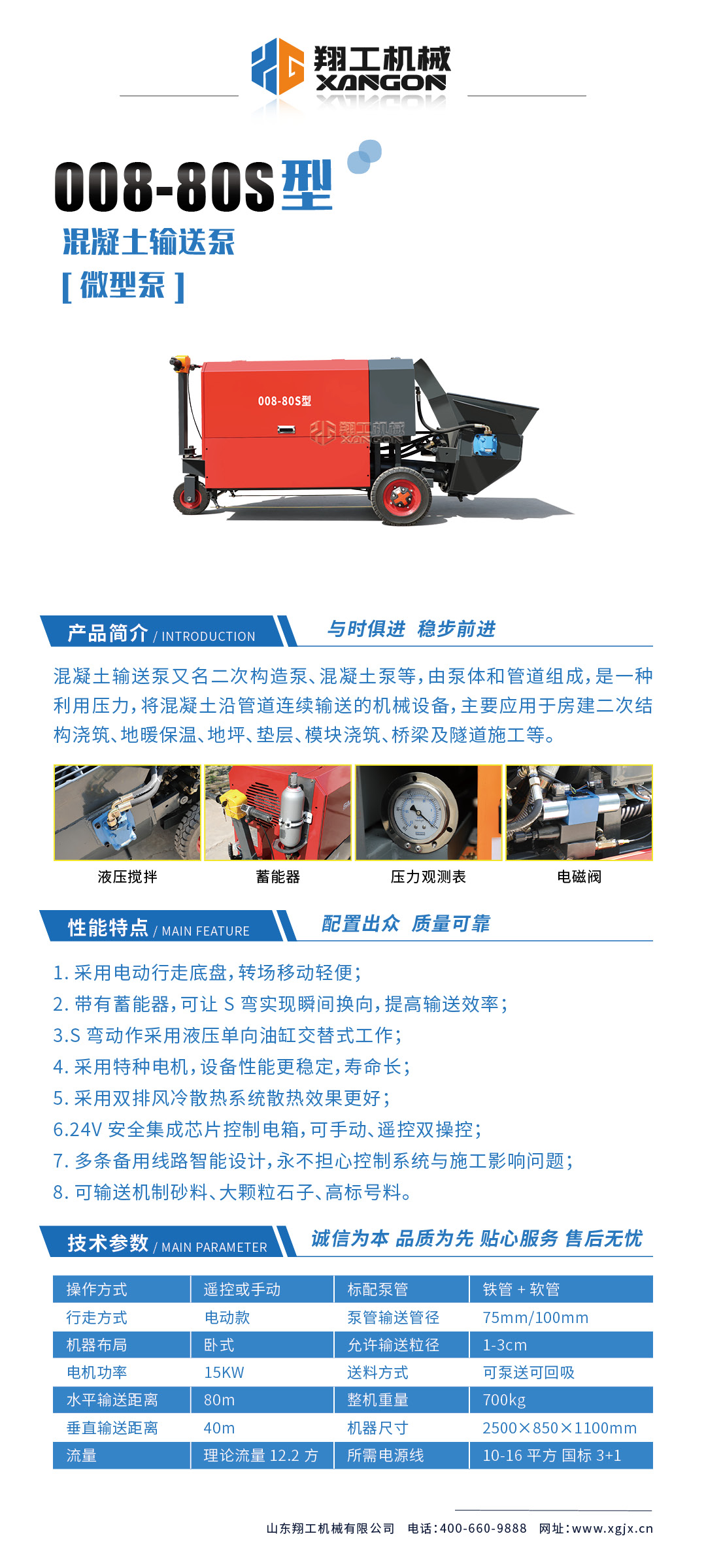 采用電動(dòng)行走底盤移動(dòng)更輕便,采用雙排風(fēng)冷散熱系統(tǒng)散熱效果更好,液壓系統(tǒng)采用國(guó)內(nèi)知名廠商葉片泵,故障率低,壽命更長(zhǎng),性能更穩(wěn)定,輸送距離更遠(yuǎn)揚(yáng)程更高,打料速度更快。